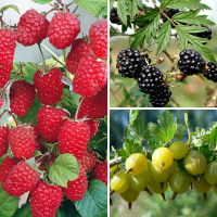 В состав комплекта входят: Малина Примара (супер ремонтантная), Ежевика кустистая Торнлесс Эвергрин и Крыжовник Белорусский Сахарный